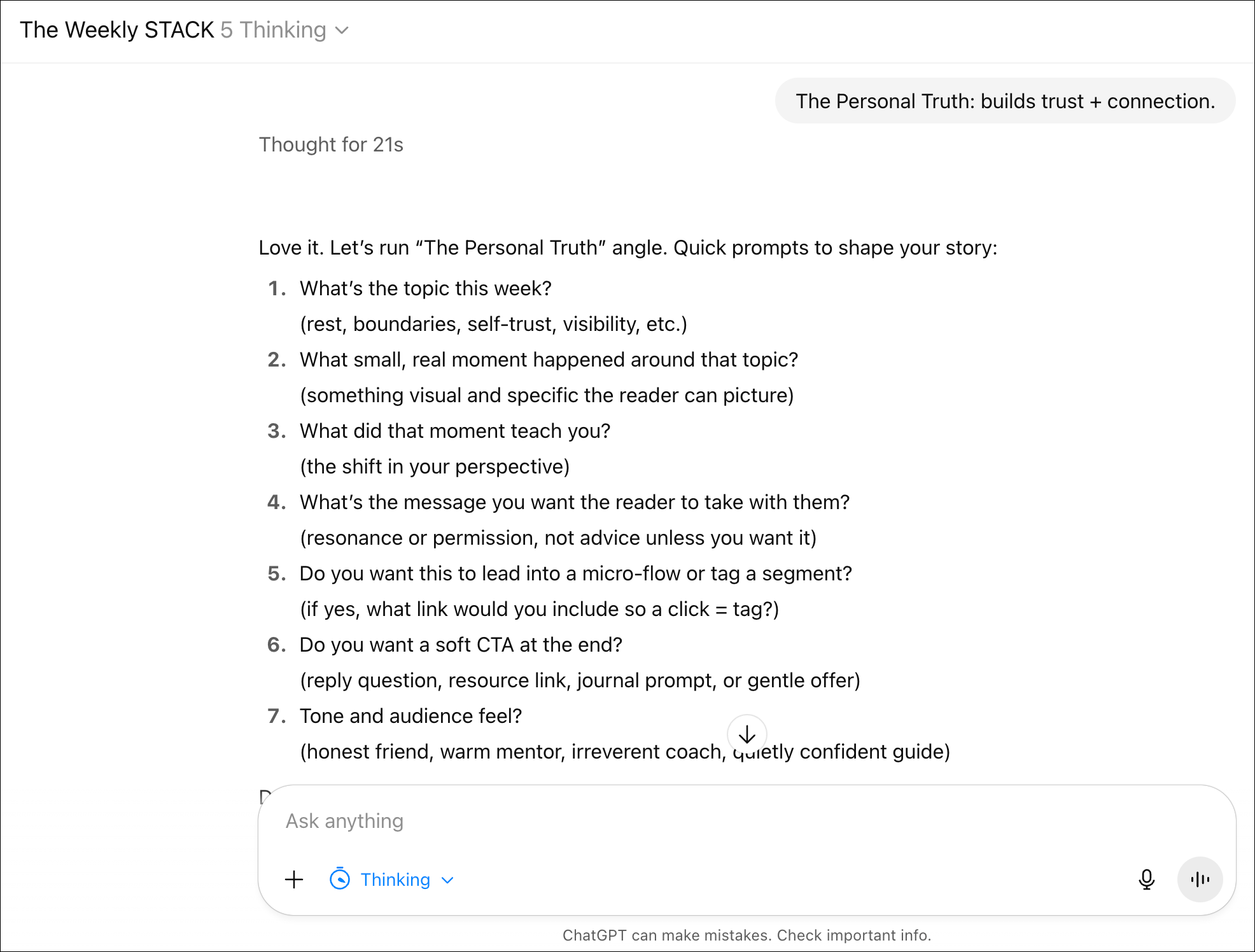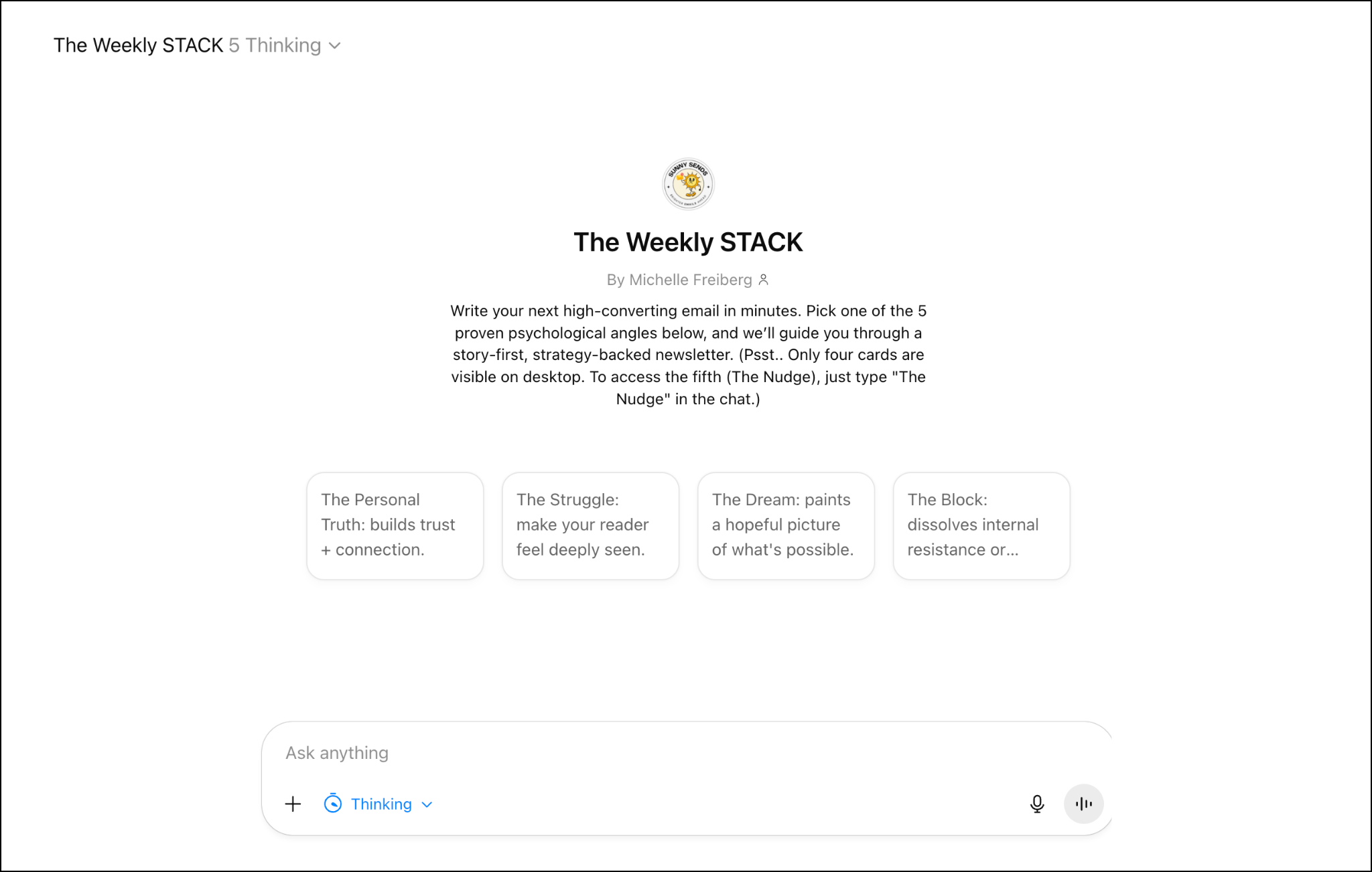 The Weekly STACK is a custom ChatGPT assistant trained to write newsletter-style emails based on my proven 5-angle framework. It includes 52 topic prompts designed to help you spin ideas into first drafts in minutes. Send authentic, strategic, and story-driven newsletters all year long.